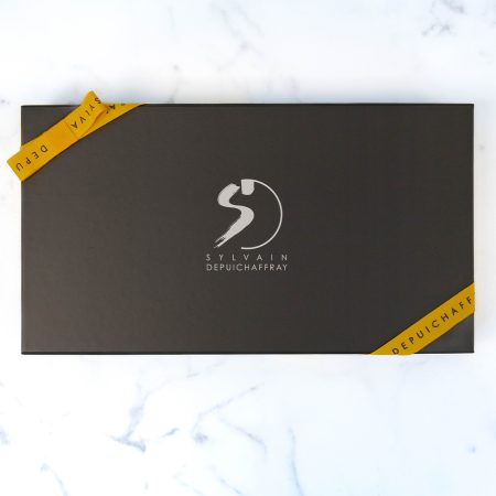 Assortiment de ganaches et de pralinés enrobés de chocolat noir (61% de cacao minimum, pur beurre de cacao) et chocolat au lait.