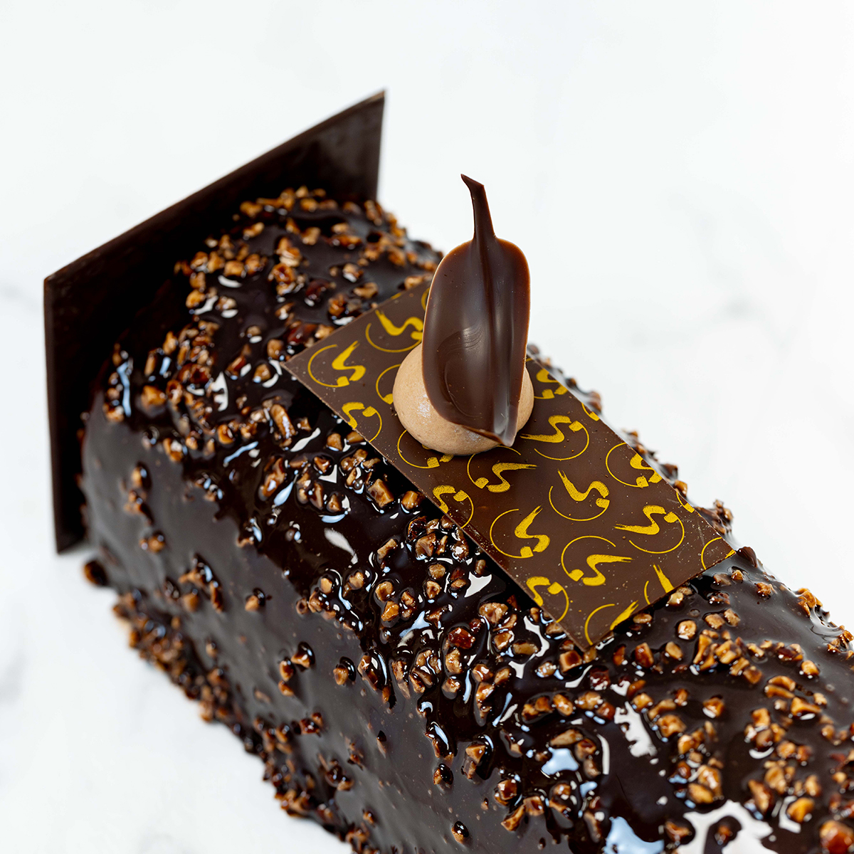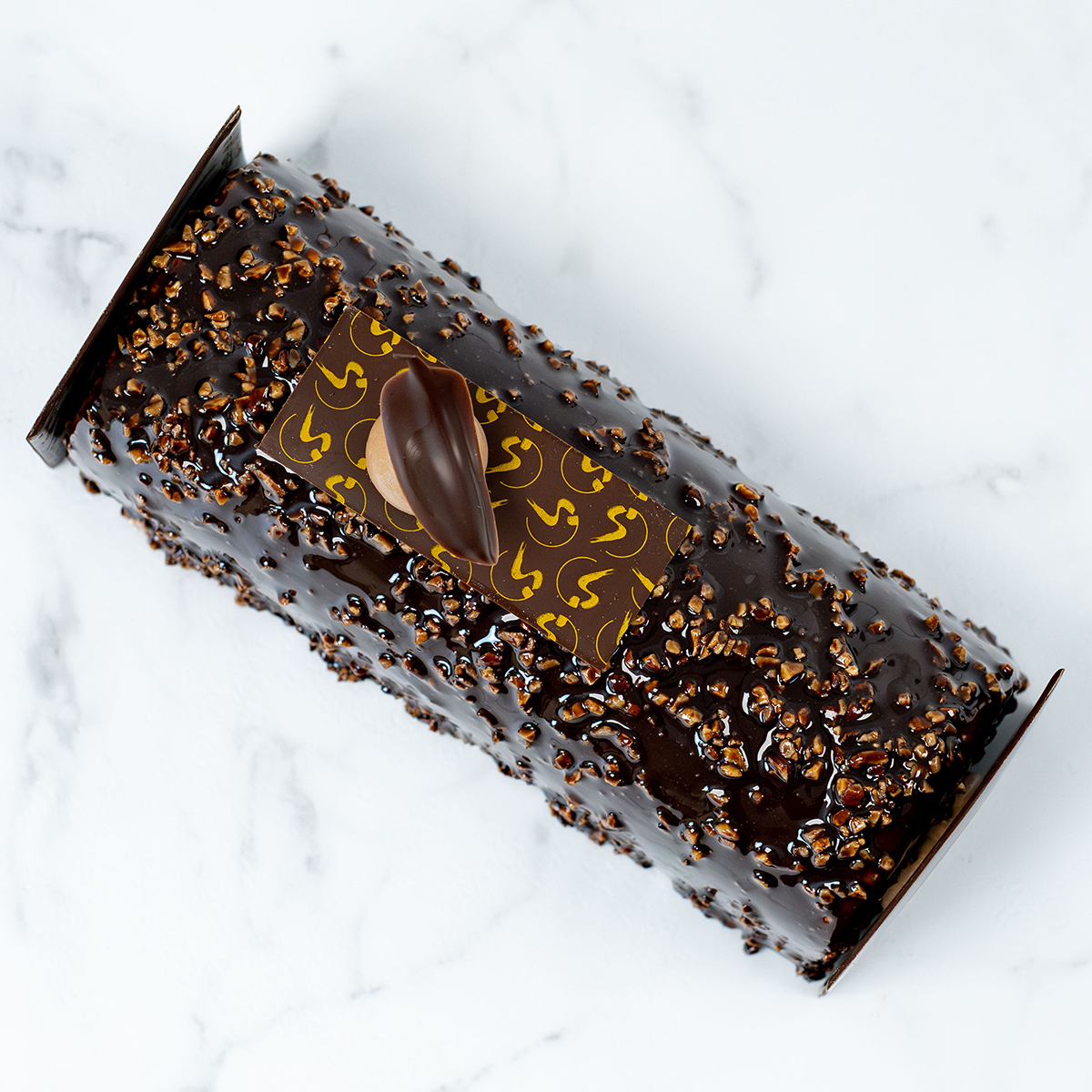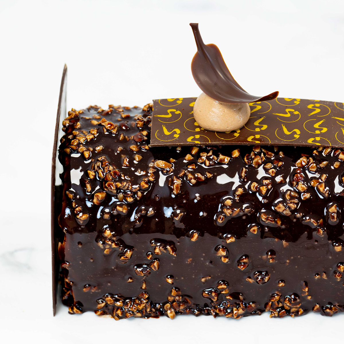 Biscuit chocolat, croustillant praliné noisettes, crémeux & mousse au chocolat noir du Ghana.
