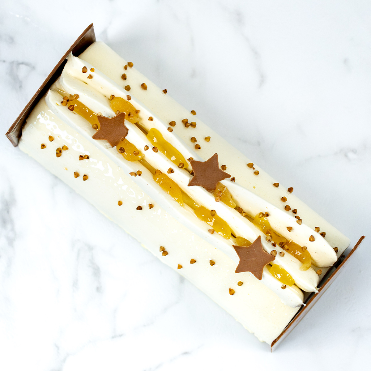 Biscuit croustillant noisettes & sarrasin, confit de poire, soupçon de citron & mousse au miel.