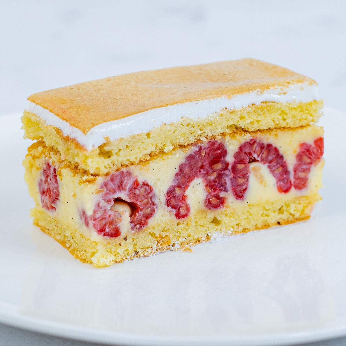 Biscuit génoise à la pâte d’amande, crème vanille ou pistache & framboises.