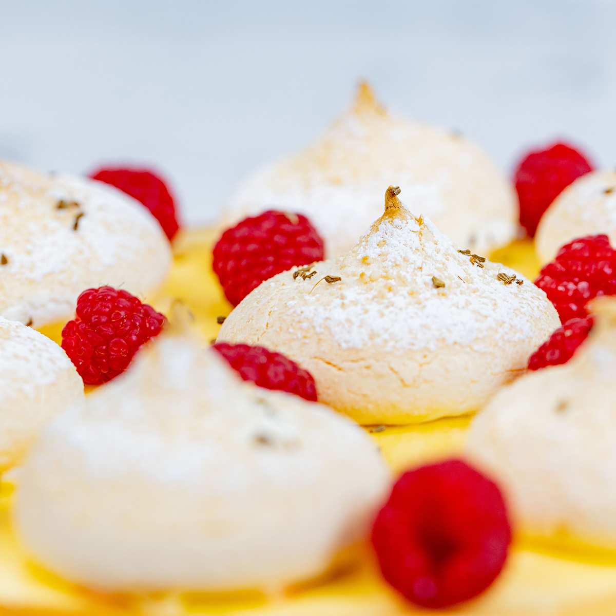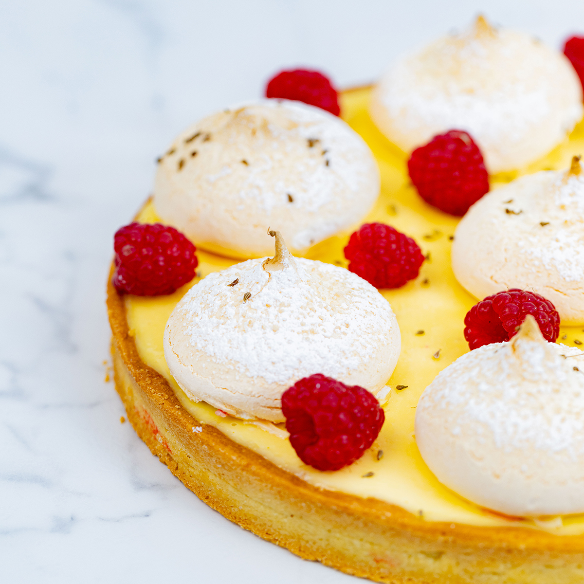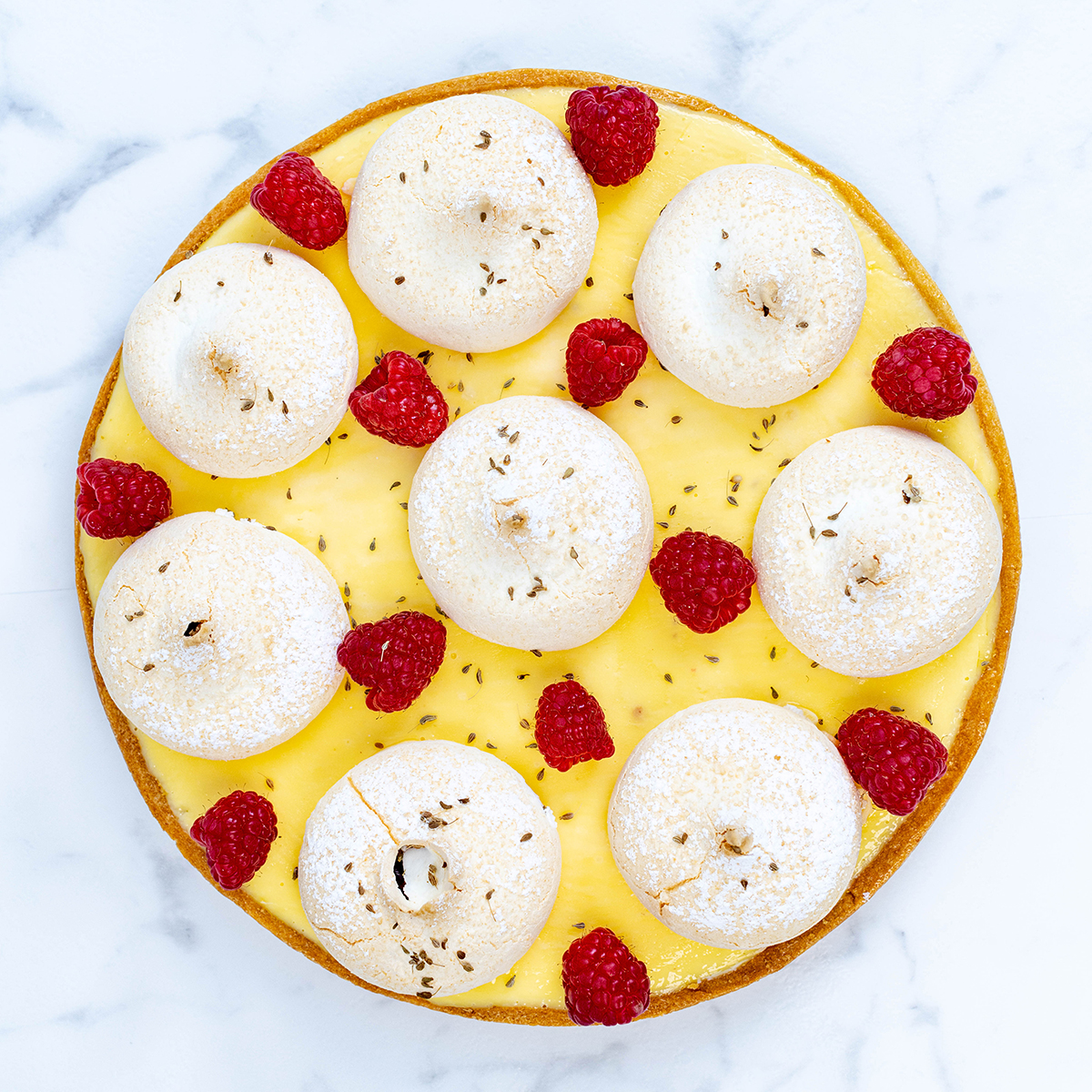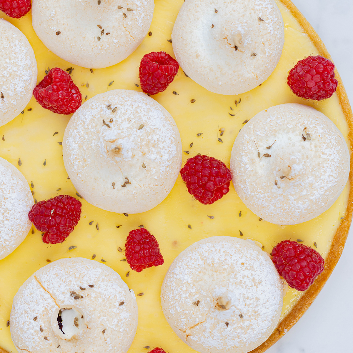 Pâte sucrée, crème d’amande, confit de framboises, crémeux citron vert & graines d’anis, meringue cuite au four.